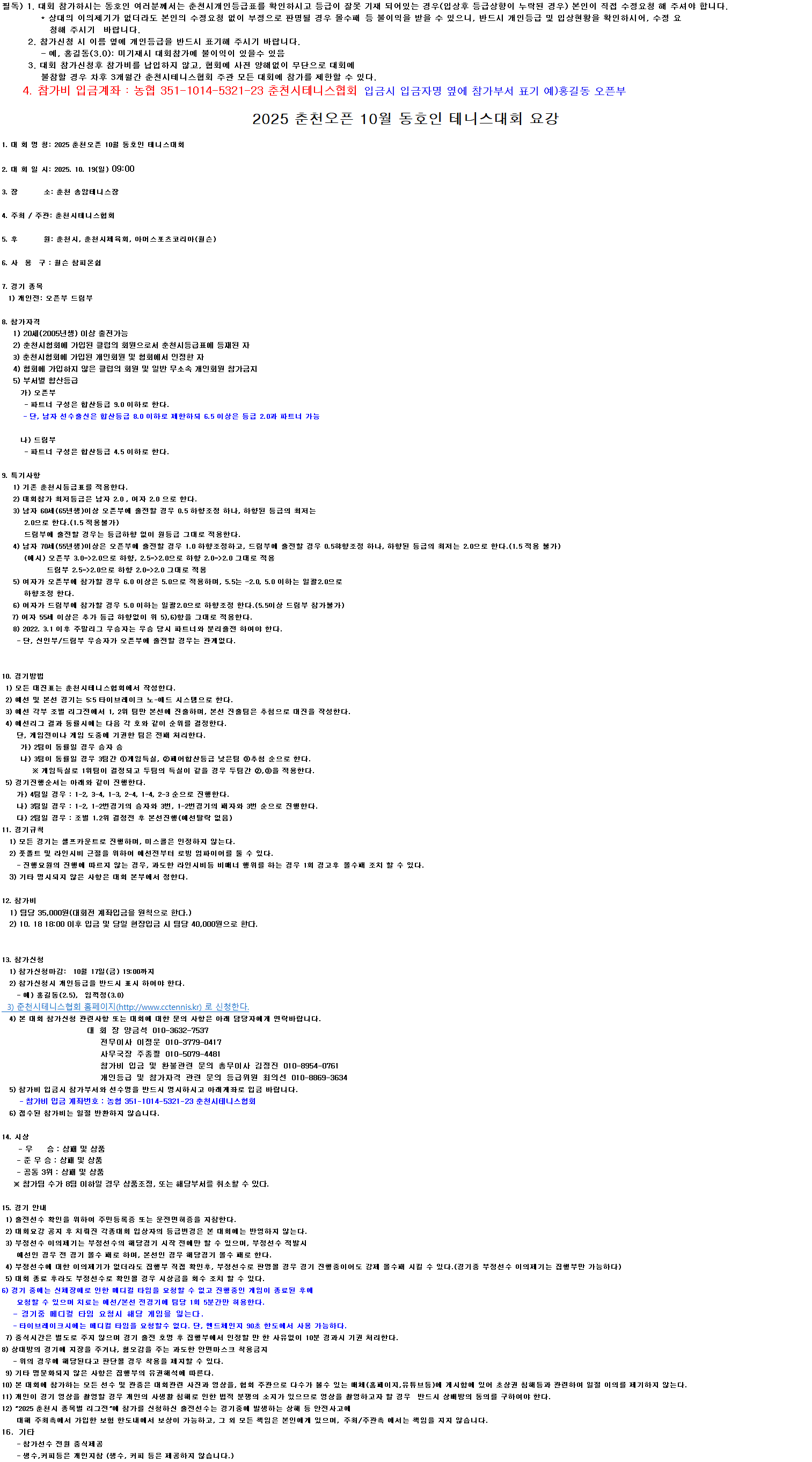 | 대회명 | 제28회 춘천시협회장기 동호인 테니스 대회 | ||||||||||||||||||||||||||||||||||||