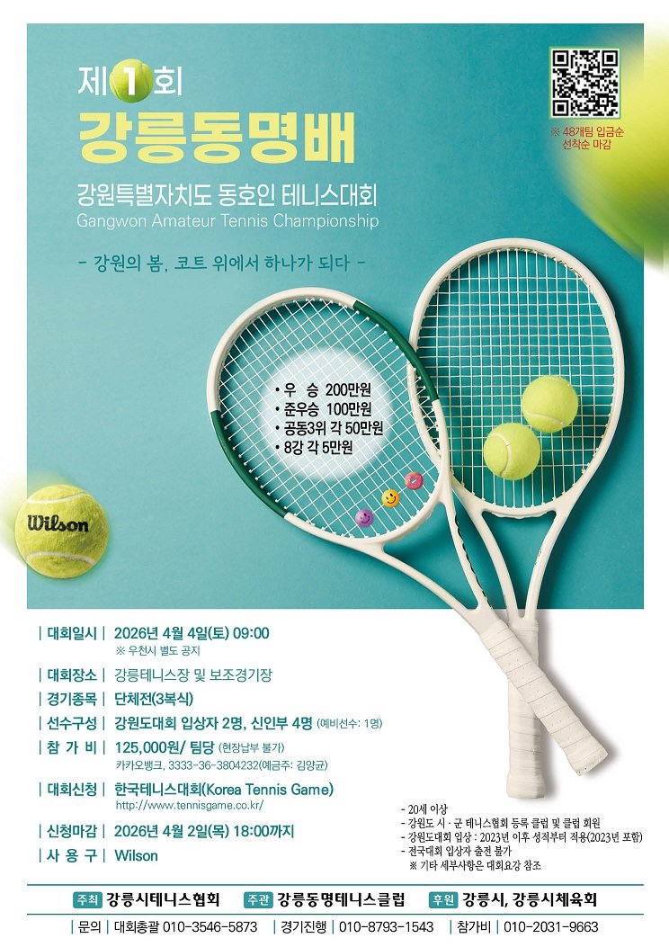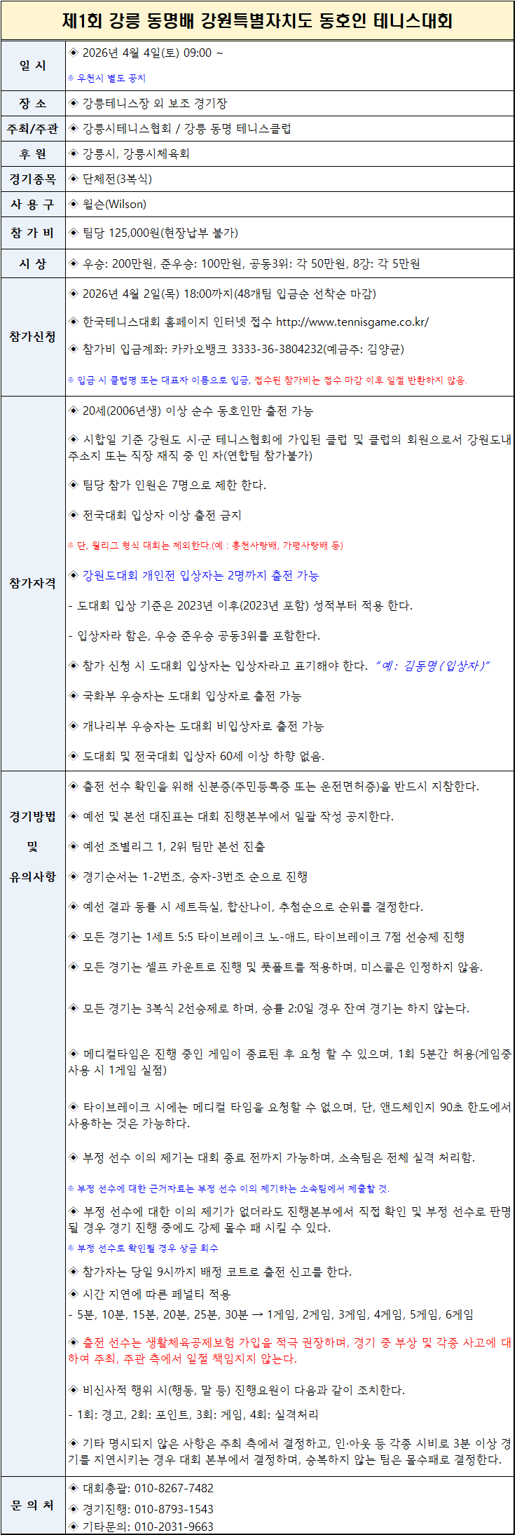 | 대회명 | 제1회 강릉 동명배 강원특별자치도 동호인 테니스대회 | ||||||||