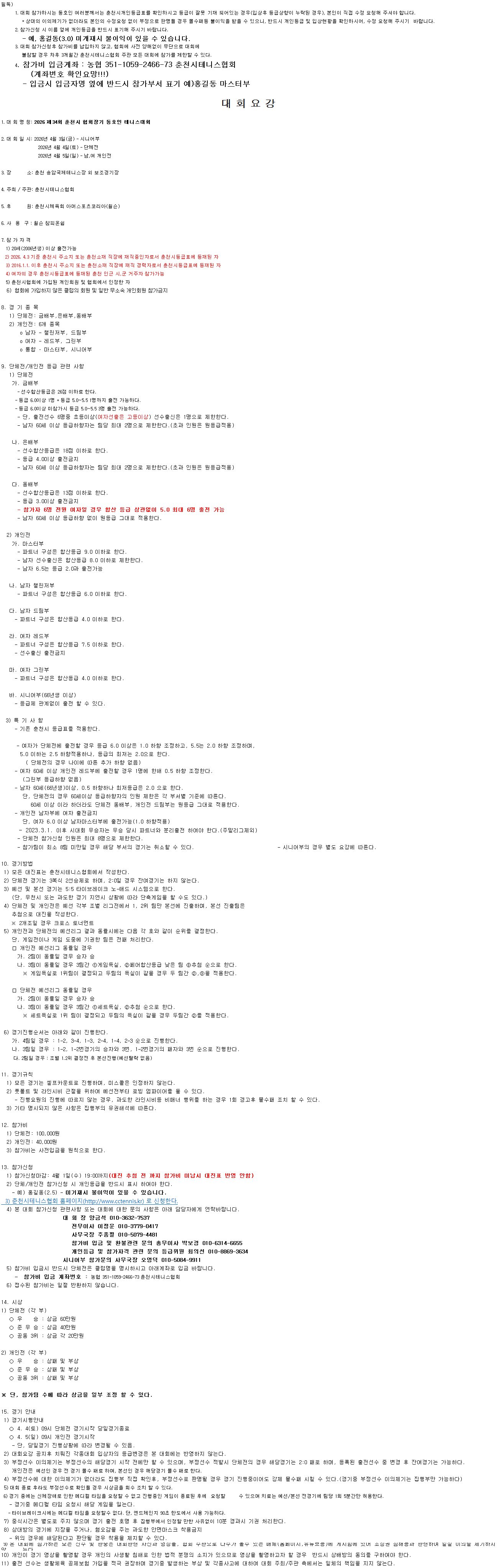 | 대회명 | 제34회 춘천시 협회장기 동호인 테니스대회 | ||||||||||||||||||||||||||||||||||||