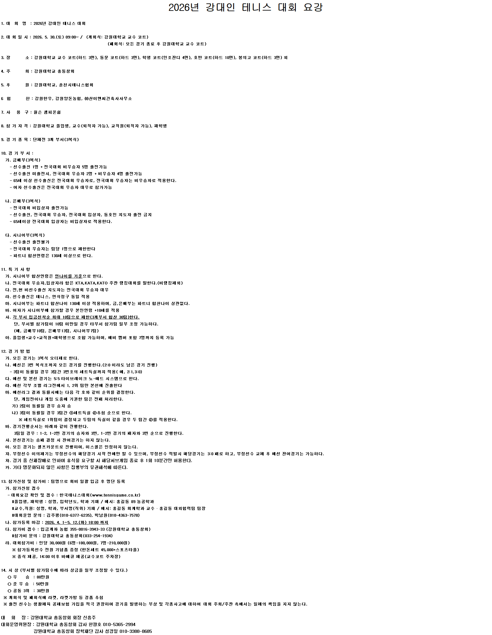 | 273 | 2026 춘천오픈 3월 동호인 테니스대회 | 강북맨 | 169 |